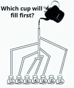 Looking at the image, we need to determine which cup will fill first based on the paths of the liquid. Upon examining the structure of the pipes leading to each cup, it appears that many of the paths are blocked or obstructed. The path to cup 1 is blocked. The path to cup 2 is…