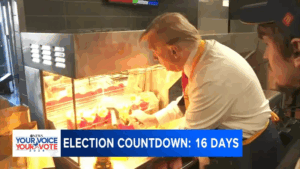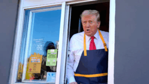 During his visit, an employee demonstrated how to properly cook and serve fries, a process that Trump called “a beautiful thing.” Sporting an apron over his suit, he appeared to enjoy the moment, but the larger message of the stop was political theater. After working the fryer, he turned the drive-thru window into a press conference podium, fielding questions from reporters. When asked about Harris’ 60th birthday, he said, “I think I’ll get her some flowers.” When pressed about raising the minimum wage, he dodged the question, instead praising McDonald’s employees as “hard-working” without committing to any policy changes.