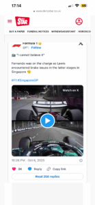 In the closing laps of the race around the Marina Bay Circuit, Hamilton suffered a major brake failure and saw his once-comfortable gap over Alonso quickly diminish as the Aston Martin veteran chased Hamilton to the line.