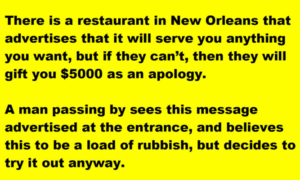 There is a restaurant in New Orleans that advertises that it will serve you anything you want, but if they can’t, then they will gift you $5000 as an apology.
