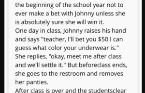 So Little Johnny’s teacher is warned at the beginning of the school year not to ever make a bet with Johnny unless she is absolutely sure she will win it. One day in class, Johnny raises his hand and says “teacher, I’ll bet you $50 I can guess what color your underwear is.”