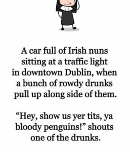 A car full of Irish nuns sitting at a traffic light in downtown Dublin, when a bunch of rowdy drunks pull up along side of them. “Hey, show us yer tits, ya bloody penguins!” shouts one of the drunks.