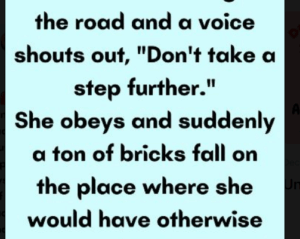 A woman is walking on the road and a voice shouts out, “Don’t take a step further. She obeys and suddenly a ton of bricks fall on the place where she would have otherwise been She thinks she imagined it and keeps walking until suddenly the voice calls out again.