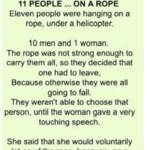 11 PEOPLE… ON A ROPE Eleven people were hanging on a rope, under a helicopter. 10 men and 1 woman. The rope was not strong enough to carry them all, so they decided that one had to leave.