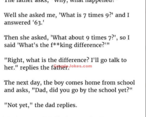 “Well, she asks me, ‘How much is 7 * 9?’ I answer ’63’ , then she asks, ‘And 9 * 7?’ so I asked ‘What’s the f*cking difference?’