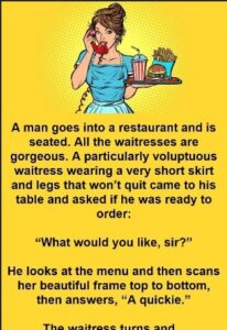 “What would you like, sir?” He looks at the menu and then scans her beautiful frame top to bottom, then answers, “A quickie. ”The waitress turns and walks away in disgust. After she regains her composure she returns and asks again, “What would you like, sir?” Again the man thoroughly checks her out and again answers, “A quickie, please.”