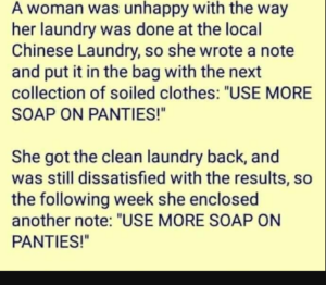 A woman was unhappy with the way her laundry was done at the local Chinese Laundry, so she wrote a note and put it in the bag with the next collection of soiled clothes: “USE MORE SOAP ON PANTIES!”