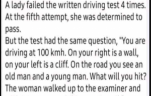 A lady failed the written driving test 4 times. At the fifth attempt, she was determined to pass. But the test had the same question, “You are driving at 100 kmh. On your right is a wall, on your left is a cliff.