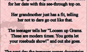 The teenage granddaughter comes downstairs for her date with this see-through top on. Her grandmother just has a fit, telling her not to dare go out like that. The teenager tells her “Loosen up Grams. These are modern times.