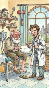 An old man goes to his doctor, complaining about a pain in his leg that doesn’t heal, and wants a diagnosis and explanation.