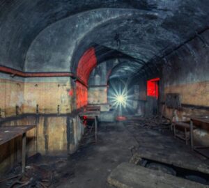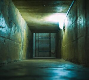 Upon reaching the lower level, the interior is revealed as a large underground chamber constructed with concrete walls and supporting beams designed to maintain structural stability over long periods of time.